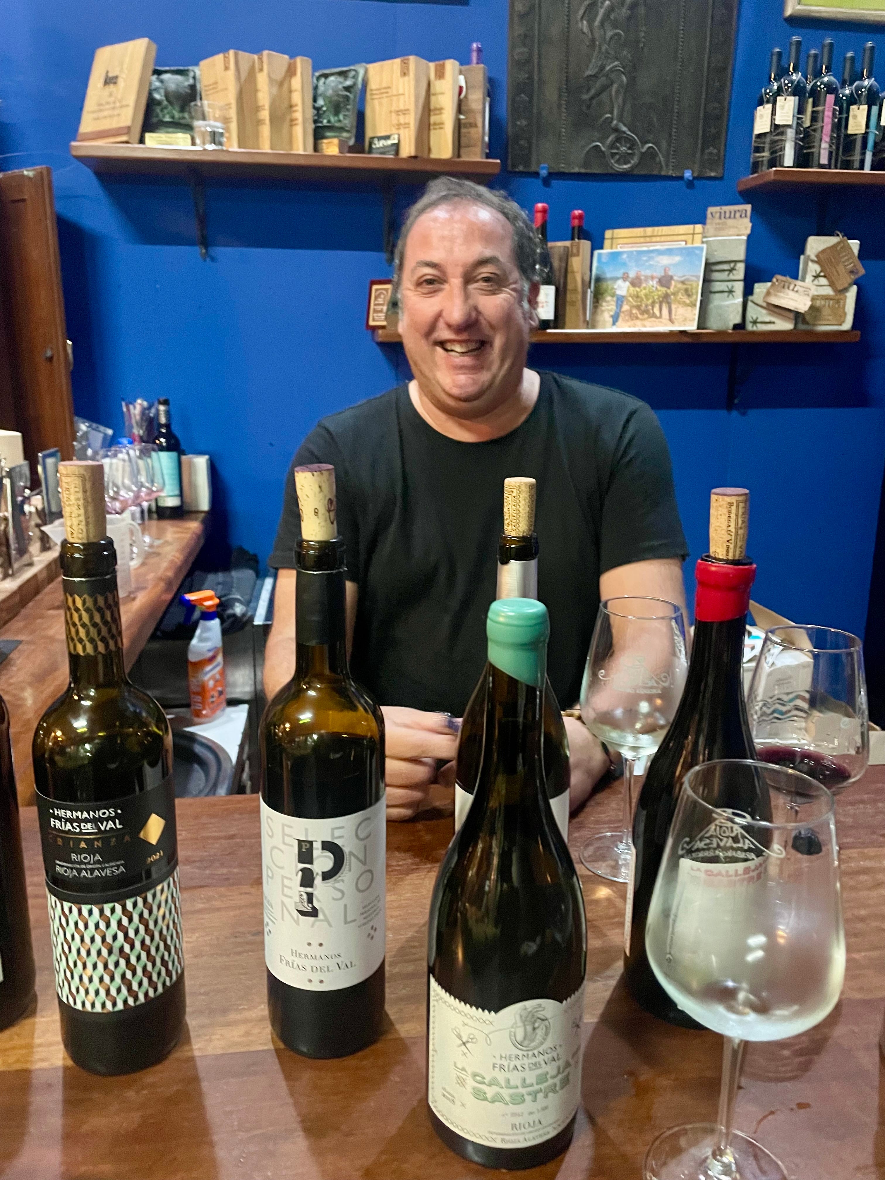 Hermanos Frías del Val Selección Personal 2016, Rioja - Gabriel and Vicente Frías del Val make wine just west of Laguardia in the village of Villabuena: Vicente showed us around. Like a growing number of Rioja producers, they reject the official Joven/Crianza/Reserva/Gran Reserva classifications, based as they are solely on the amount of time a wine has spent in oak and bottle. Their approach is instead more attuned to terroir - and their 26 hectares of wines, with an average age of 50 years, are scattered across 70 different parcels. This is one of their fancier cuvées, from a difficult year: 12 months in oak and four in bottle before release (so technically a Reserva, though it is generically labelled as "Joven”): dark fruit, powerful yet elegant and balanced. I brought home a case of this, as well as of their excellent Viña del Flako white Rioja (N/A UK: these guys really deserve a British importer.)